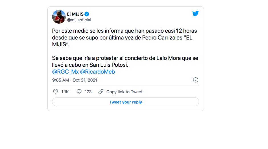 Hace un momento a través de la cuenta de twitter del diputado informaron que ya había sido localizado pedro carrizales, sin embargo, no reveló más detalles sobre su desaparición de casi 16 horas. 1 day ago · pedro césar carrizales becerra, el mijis, fue reportado como desaparecido desde ayer cuando iba a protestar pacíficamente contra lalo mora, a … Crece la polémica por el ranking congelado: Oct 08, 2021 · el mijis acudió esta mañana a la sede de la fiscalía, luego de que en días pasados circularon videos en los que el cantante, quien originalmente se dio a … Oct 08, 2021 · el video por el cual el mijis realizó esta denuncia fue difundido a través de las redes sociales y los medios de comunicación causando la molestia de una gran parte de la sociedad.